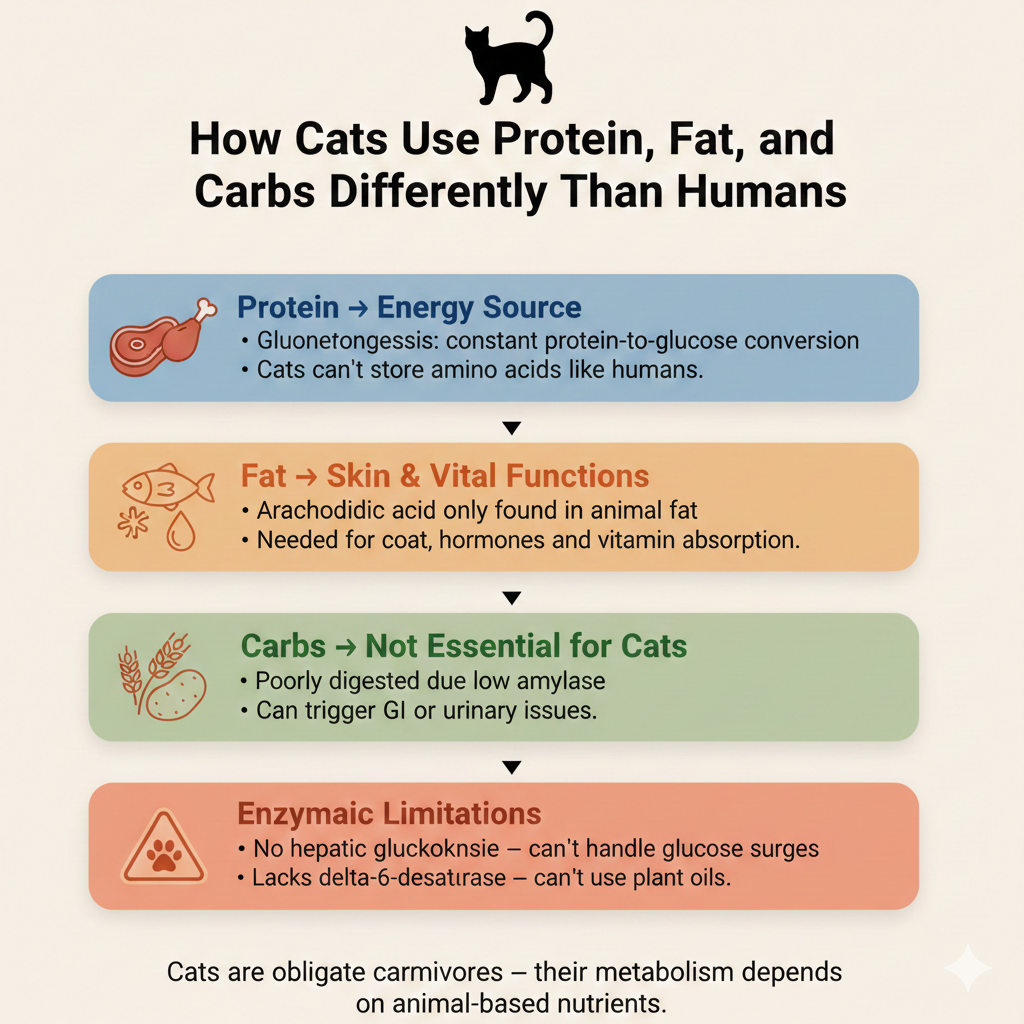 Click here to download the infographic — a simple, vet-reviewed breakdown of how cats process protein, fat, and carbs differently than humans.
