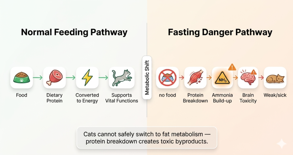 But inside your cat’s body, something far more dangerous happens. This visual breaks down the “protein → energy” pathway vs. the “protein breakdown → toxin” trap—so you can see exactly why even short fasting periods can become life-threatening.